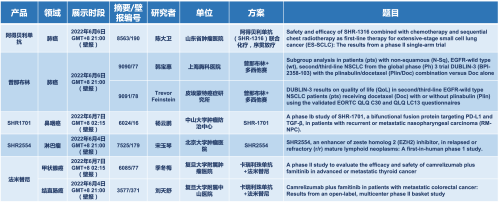 2022 ASCO年会另有5款AG视讯医药上市前抗肿瘤创新药的相关研究被接收为壁报,包括SHR-1316、普那布林、法米替尼、SHR-1701和SHR2554,他们的单药或联合方案相关7项研究被接收为壁报,覆盖肺癌、鼻咽癌、淋巴瘤、甲状腺癌和结直肠癌等领域。